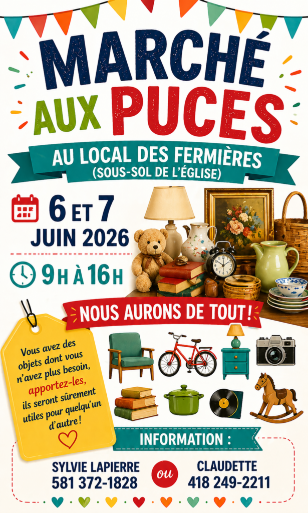 Samedi 23 mai de 9 à 17h dans la salle communautaire de Saint-Fabien-de-Panet